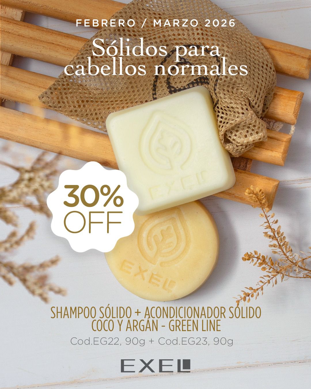 Promo EXEL – Shampoo Sólido + Acondicionador Sólido Cabellos Normales Coco y Argan